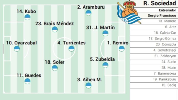 Teniendo en cuenta que el próximo miércoles vuelve a haber LaLiga (Anoeta, miércoles 24 de septiembre, 21.30 horas contra el Mallorca), Sergio podría hacer rotaciones. Aramburu y Kubo volverán a un once en el que podría estar por primera vez de titular Carlos Soler. Además Jon Martin, que se perderá 3-4 semanas de competición por el Mundial sub 20, podría entrar en lugar de Caleta-Car, y Barrenetxea también podría descansar, aunque el donostiarra está en un gran momento de forma. Mikel Oyarzabal es indiscutible en ataque, y Brais apunta a ser quien ocupe el lugar de Mikel Goti.