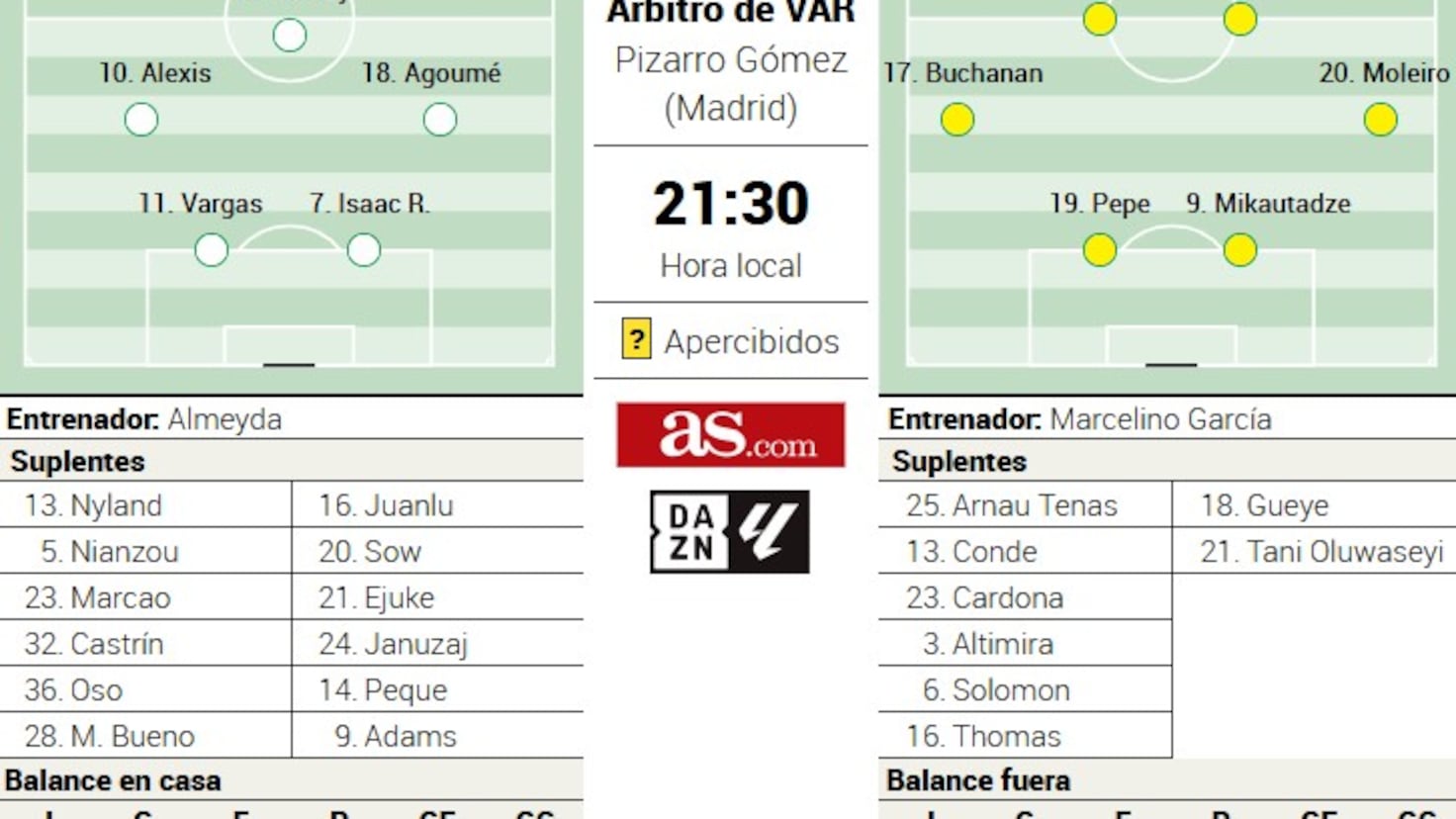 Con ello, el posible once sería el formado por Luiz Júnior en la portería, con una defensa formada por Santiago Mouriño, Rafa Marín, Renato Veiga y Santi Cardona. Un centro del campo con Santi Comesaña y Dani Parejo, a los que podrían acompañar en las bandas Tajon Buchanan y Alberto Moleiro. Mientras, la pareja de atacantes podría ser la formada por Georges Mikautadze y Tani Oluwaseyi o Nicolás Pepe.
